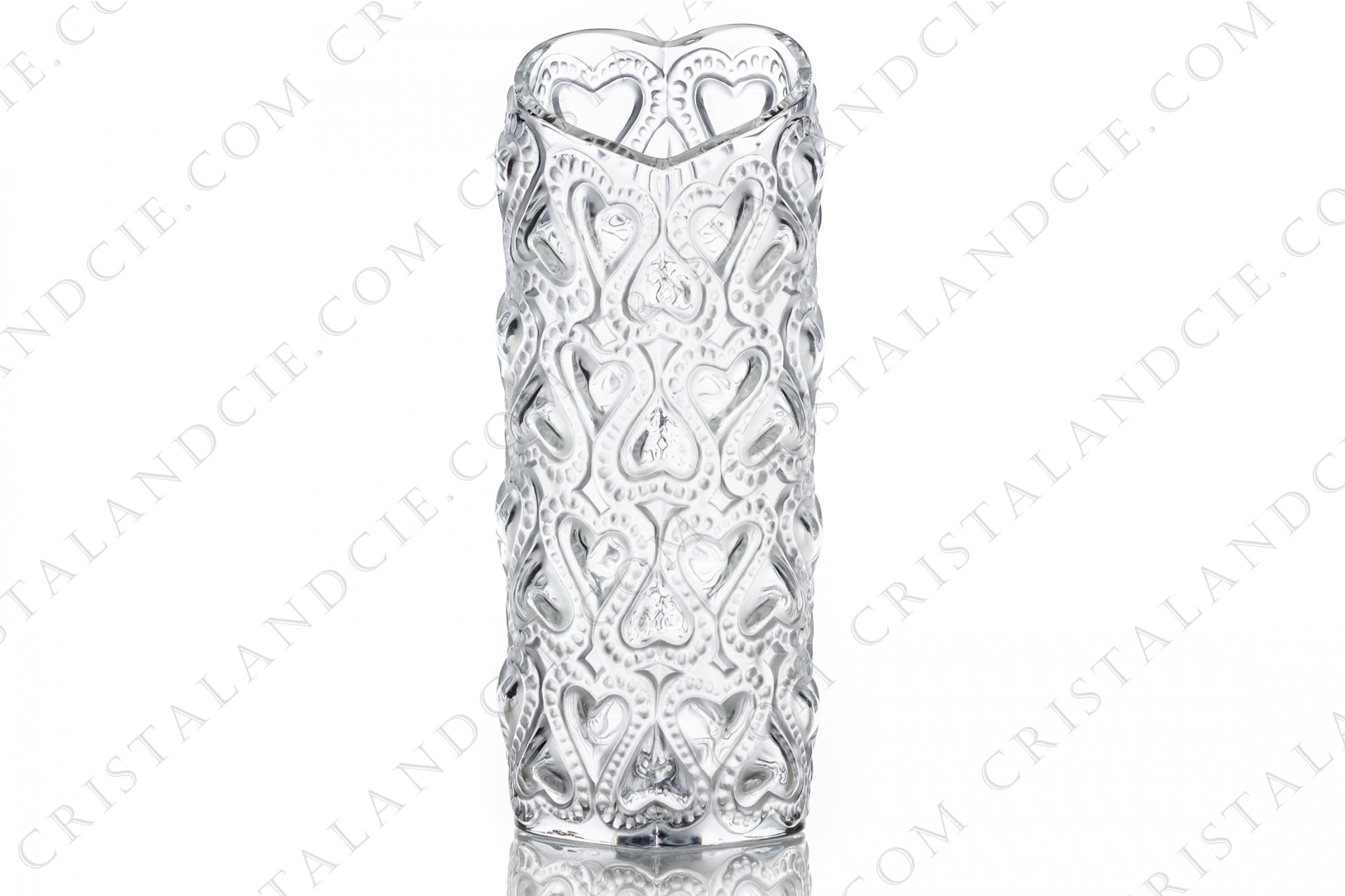 description: Vase en cristal clair et dépoli de Lalique modèle Amour orné de cœurs. Excellent état. Ht: 15,6 cm L: 5,6 cm l: 4,6 cm.