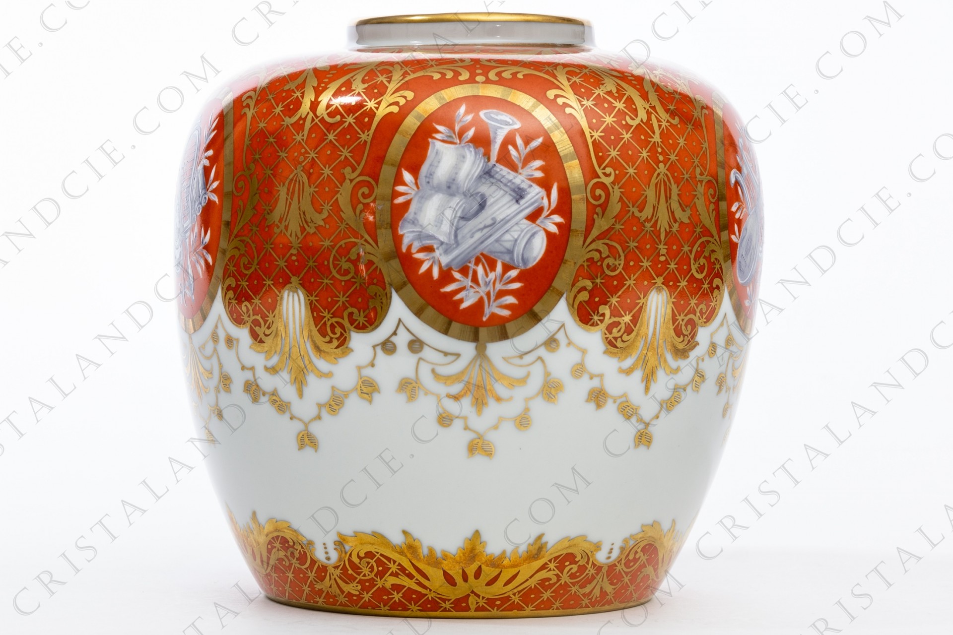Vase en porcelaine de Paris décoré à la main par les ateliers Le Tallec orné des attributs de la musique en grisaille émaillés et d'arabesques or sur fond orange et blanc. Datant de 1971.