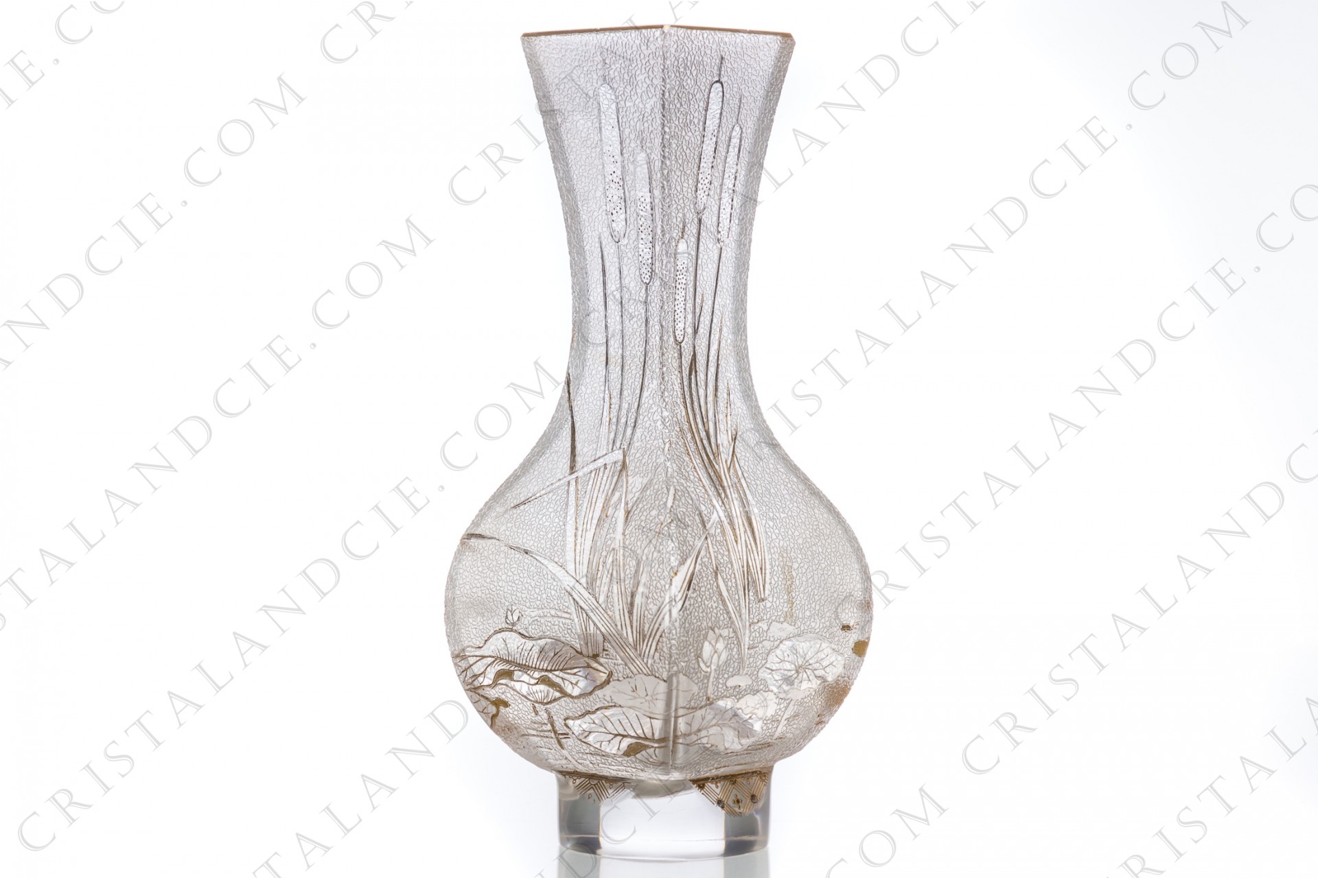 Vase aux nénuphars et roseaux en cristal de Baccarat, inspiré de forme et décor chinois gravé à l'acide et peint à l'or. Datant de 1896. Référencé dans le livre "Baccarat" de JL. Curtis et V. Nansenet aux Editions du regard.