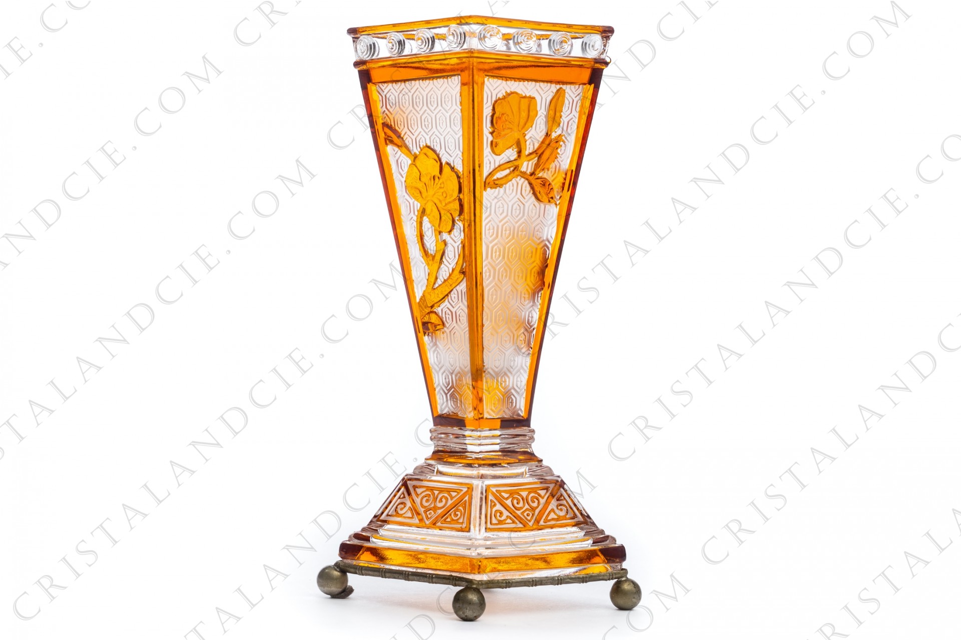 Vase en cristal moulé doublé orange satiné et poli de Baccarat à décor de fleurs de cerisier sur un fond nid d'abeille. Monture en bronze argenté. Datant de la deuxième moitié du XIXè siècle.