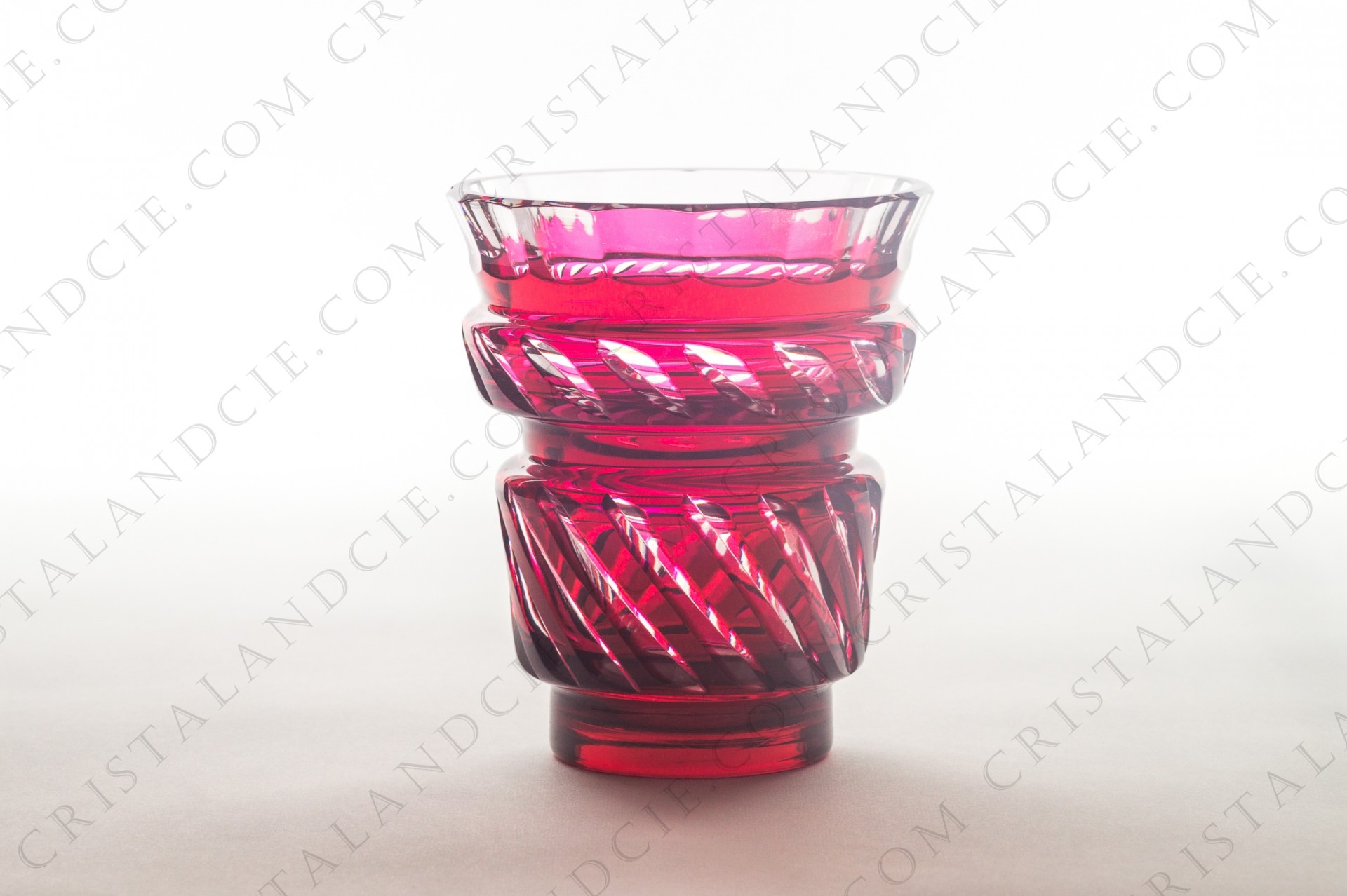 Vase en cristal double couche rouge de Val-Saint-Lambert à décor strié, présentant une bague sur le col.