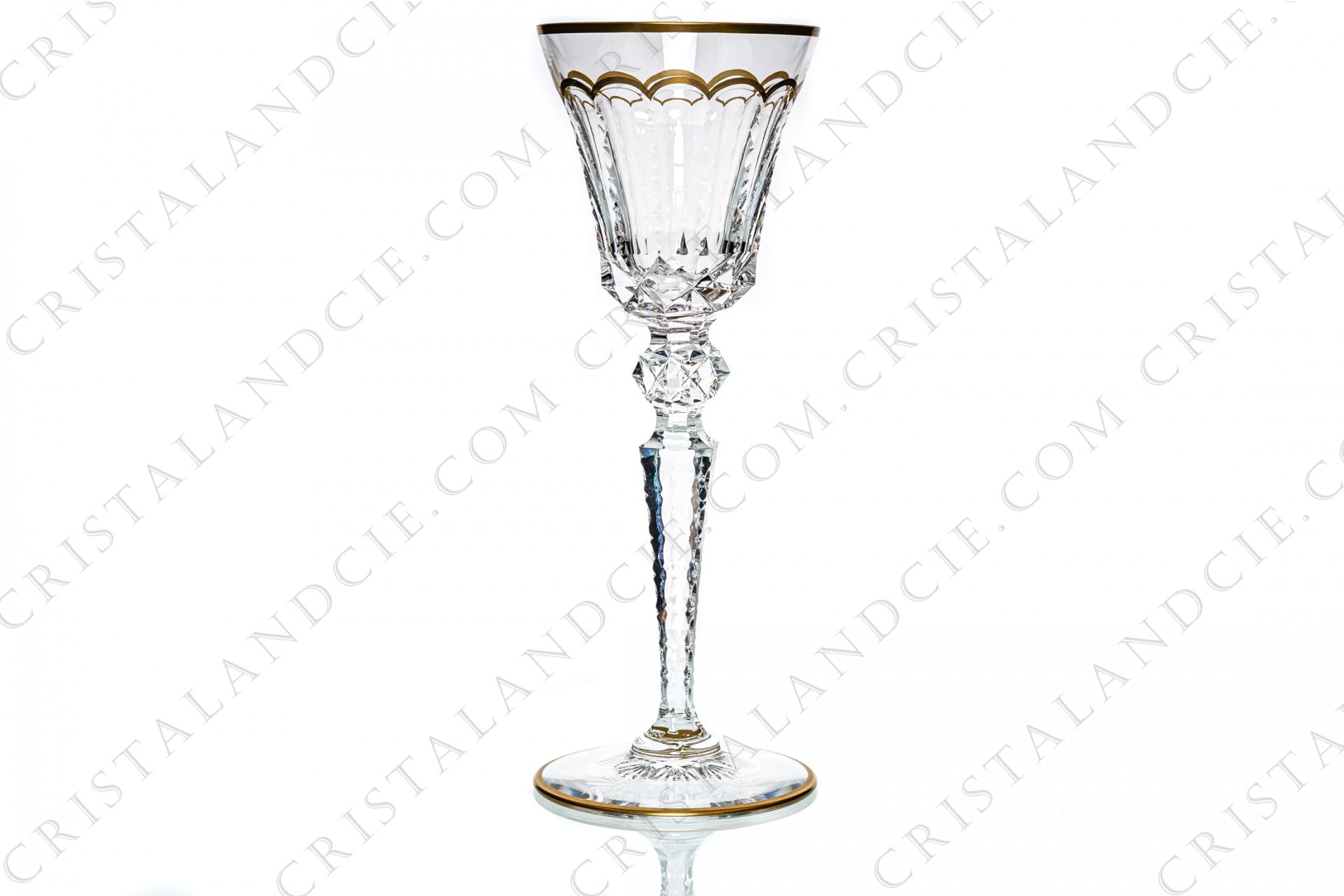 Verre à eau n°2 en cristal de Saint-Louis modèle Excellence présentant un riche décor à pans coupés ciselés et pointes de diamant et filets or. Modèle créé en 1967. Trop ancien pour être estampillé.