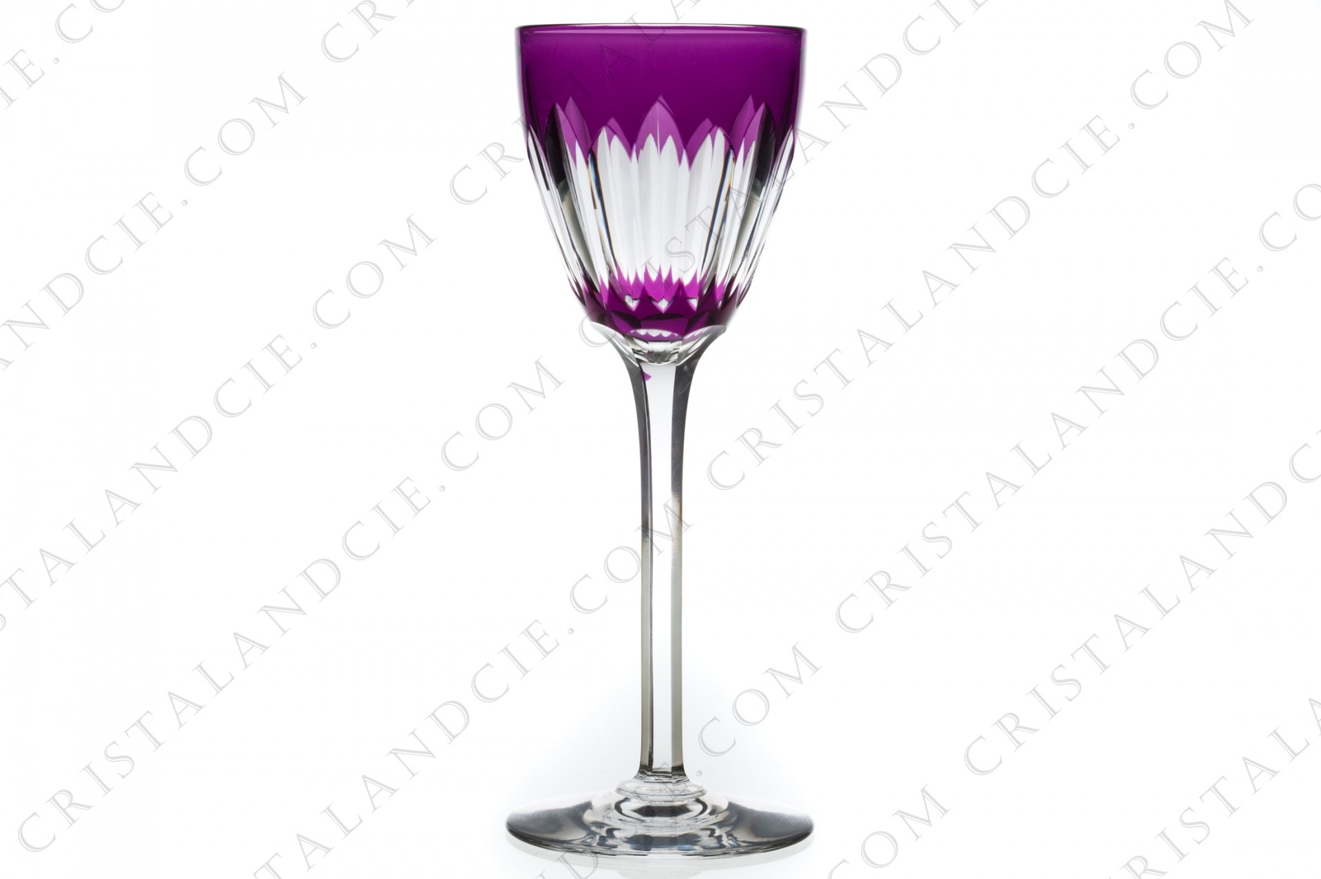 Verre à vin du Rhin roemer en cristal double-couches améthyste de Baccarat modèle Vérone dont la paraison est ornée de biseaux et la jambe taillée. Modèle produit de 1954 à 1961.