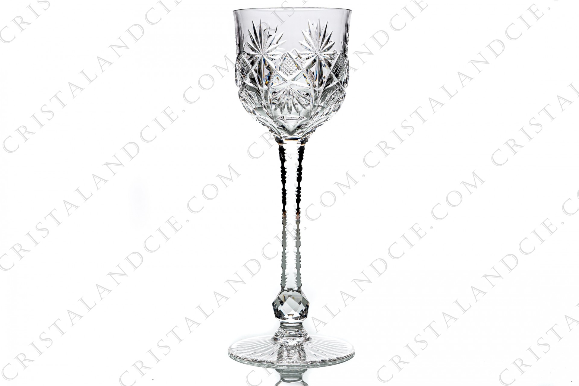 Verre à vin du Rhin roemer en cristal de Saint-Louis modèle Cosmos taille 7113 présentant un important décor taillé sur la paraison, une jambe ciselée munie d'une bague à facettes et une étoile sous le pied. Datant des années 1930-40. Trop ancien pour être estampillé.
