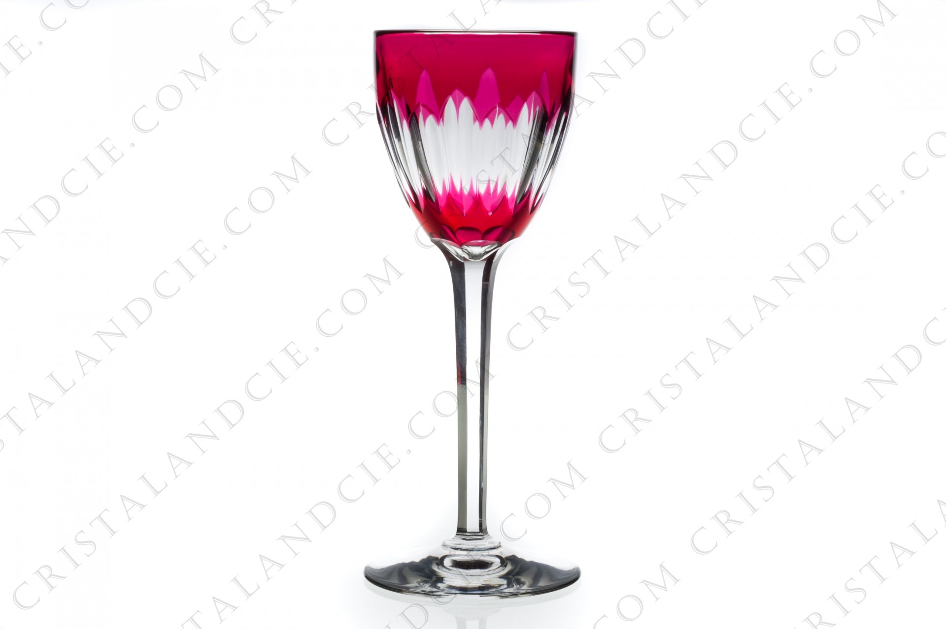 Verre à vin du Rhin roemer en cristal double-couches rose de Baccarat modèle Vérone dont la panse est ornée de biseaux et la jambe taillée. Modèle produit de 1954 à 1961.