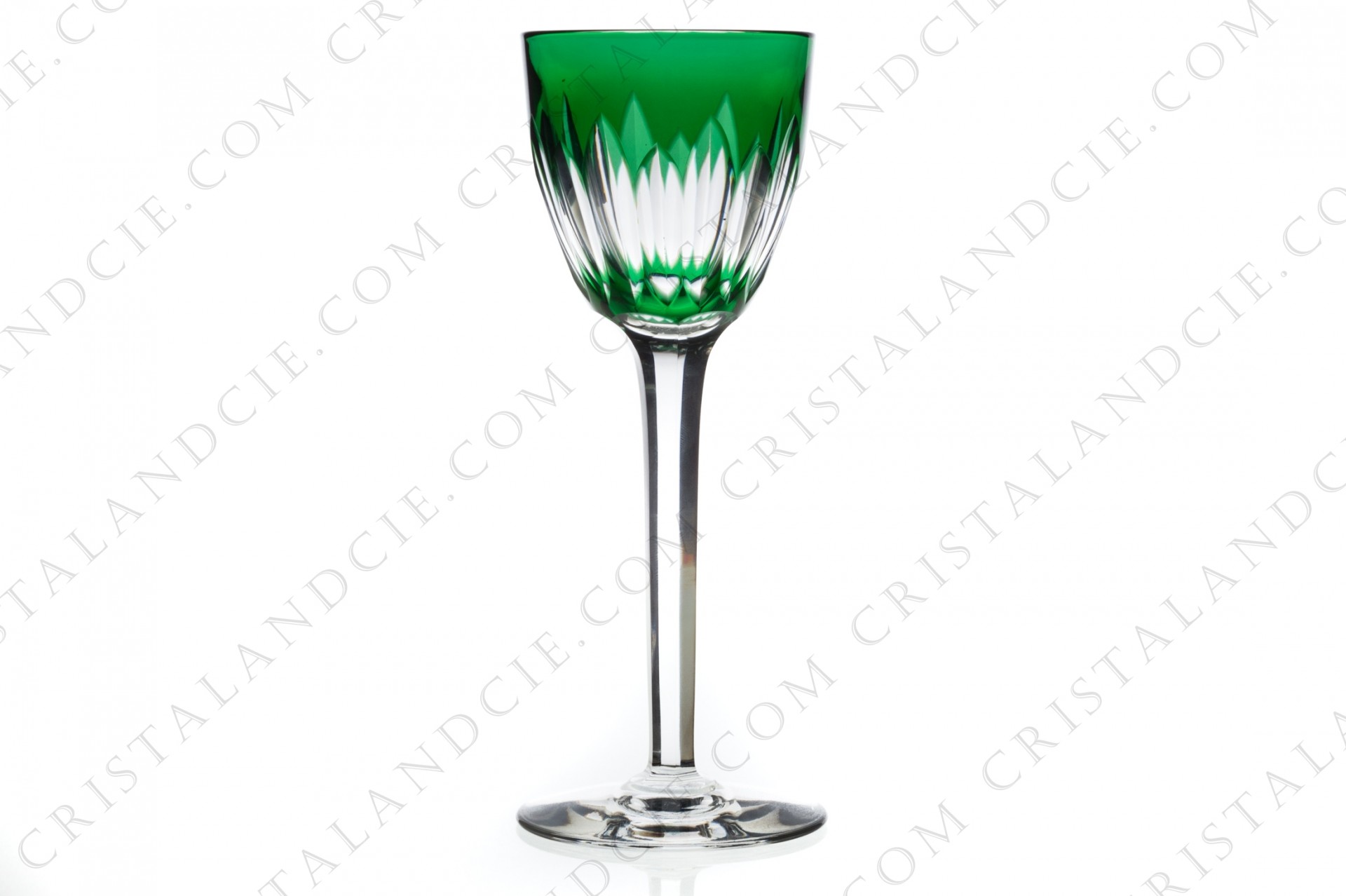 Verre à vin du Rhin roemer en cristal double-couches vert de Baccarat modèle Vérone dont la paraison est ornée de biseaux et la jambe taillée. Modèle produit de 1954 à 1961.
