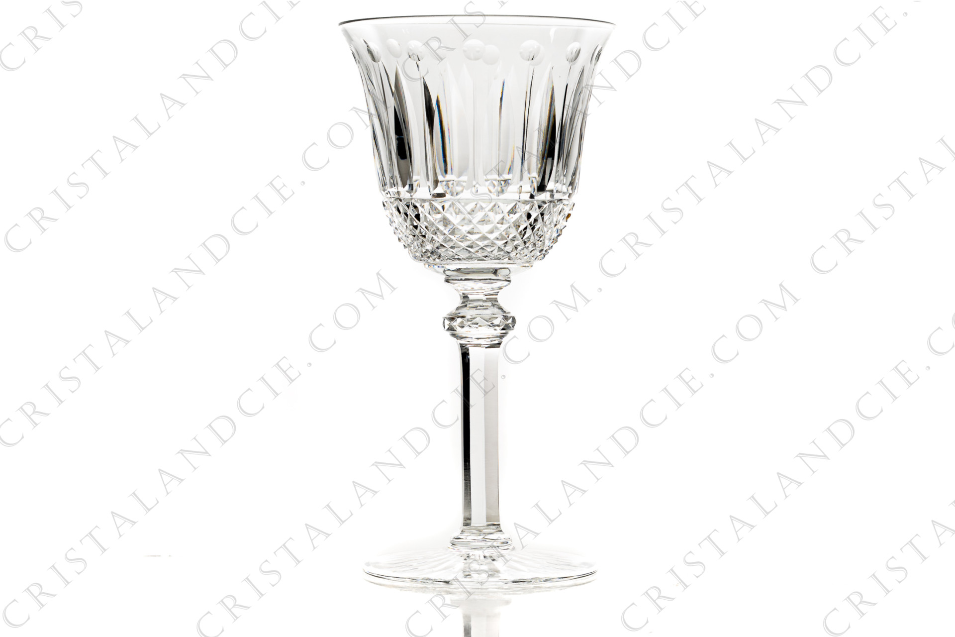 Verre à vin rouge n°3 en cristal de Saint-Louis modèle Tommy présentant un important décor taillé. Modèle créé en 1928. Trop ancien pour être estampillé.